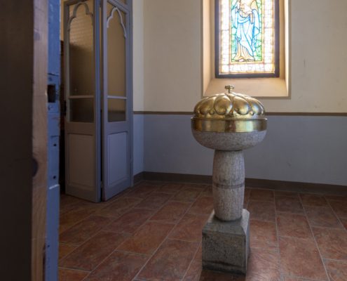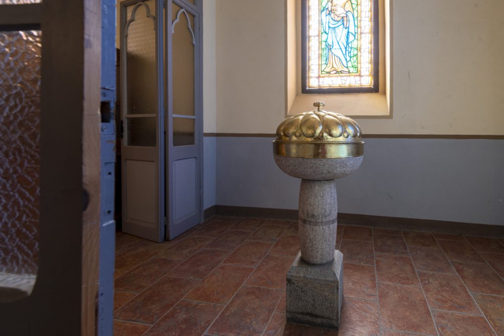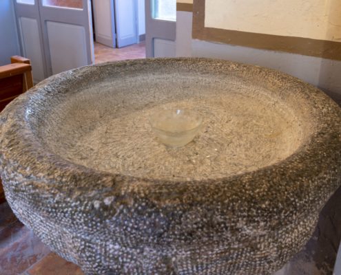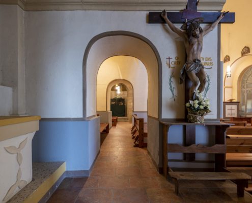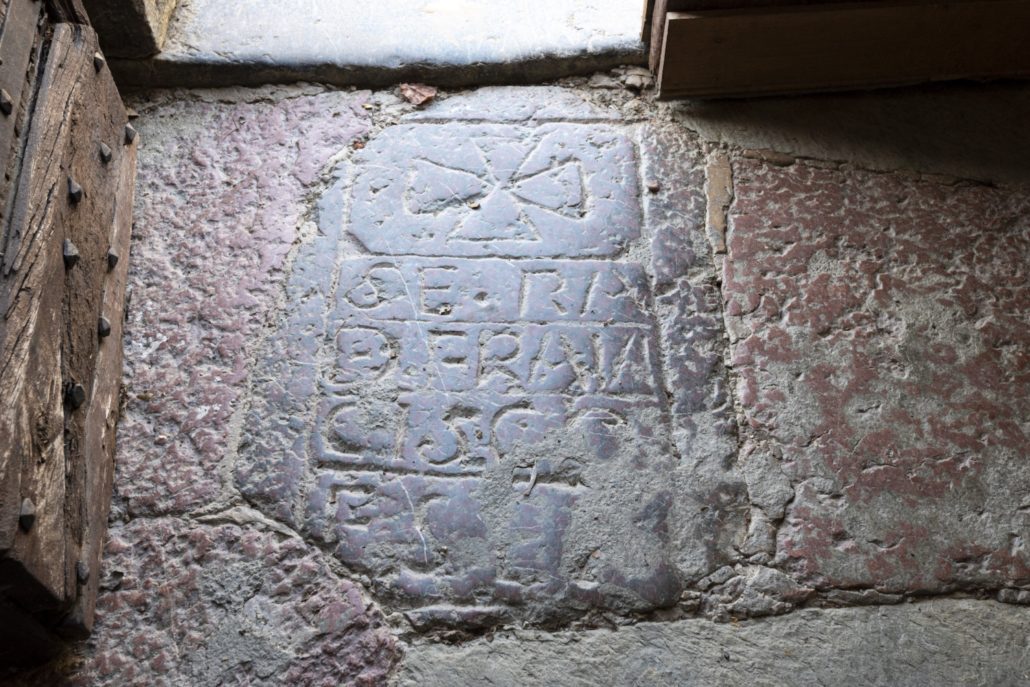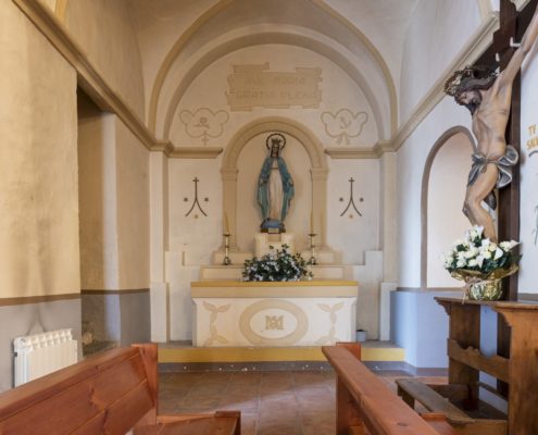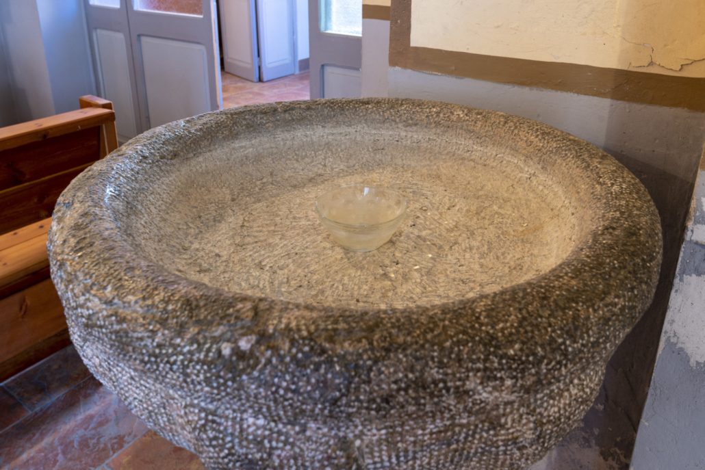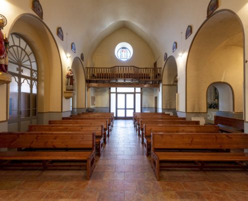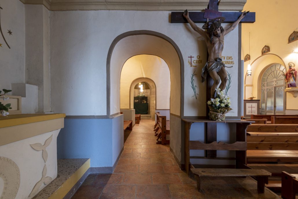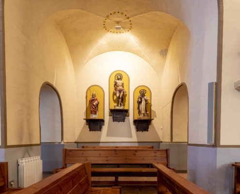 Lo más destacable es la puerta principal situada a poniente, que hoy acoge la puerta con el conjunto de herramientas de época románica. La puerta del siglo XVIII está hecha con mármol rosa de Isòvol y presenta a ambos lados los sillares de los montantes esculpidos con la leyenda de los cazadores y los perros.