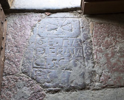 Se encuentra delante de un edificio muy reconstruido del siglo XVIII (la fecha de 1740 aparece esculpida en la dovela central de la puerta) pero fue quemado en 1936 lo que destruyó la cubierta, la fachada de mediodía y parte de la poniente. Gracias a la contribución de dinero o de trabajo de la gente de Ger se reconstruyó durante la posguerra.
