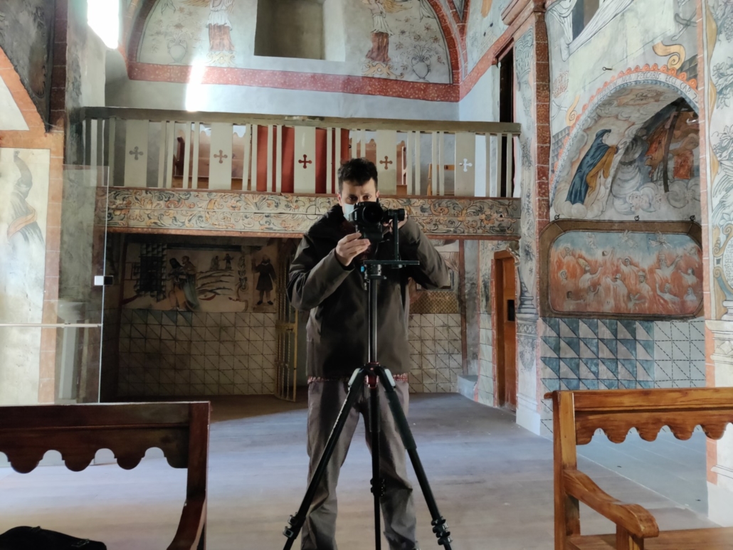 Pla americà d’una persona amb una càmera fotogràfica 360 graus obtenint instantànies de l’interior de l’església de Sant Climent de Talltorta, a Bolvir.