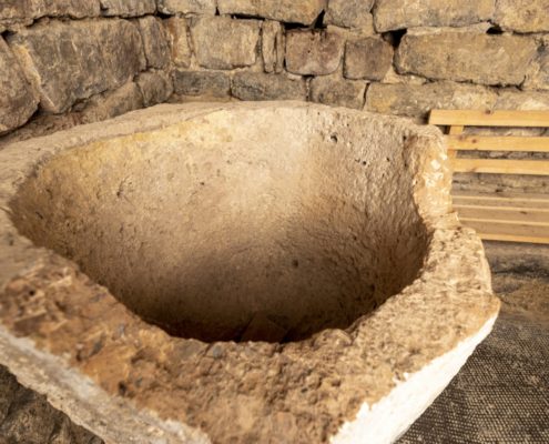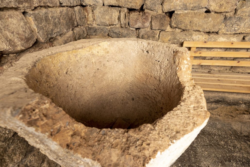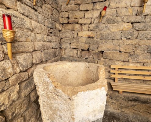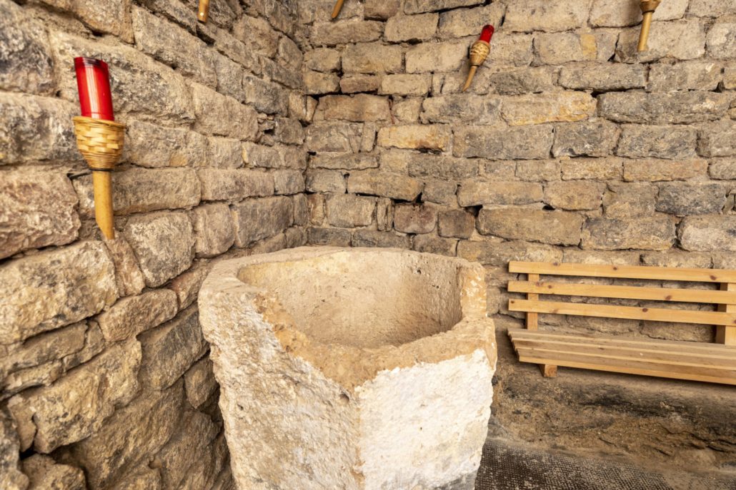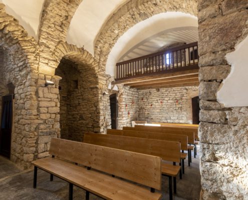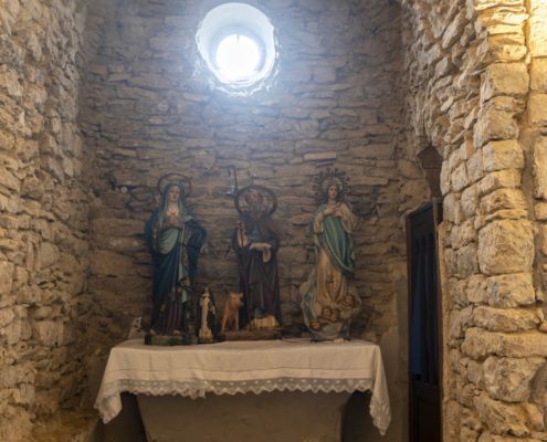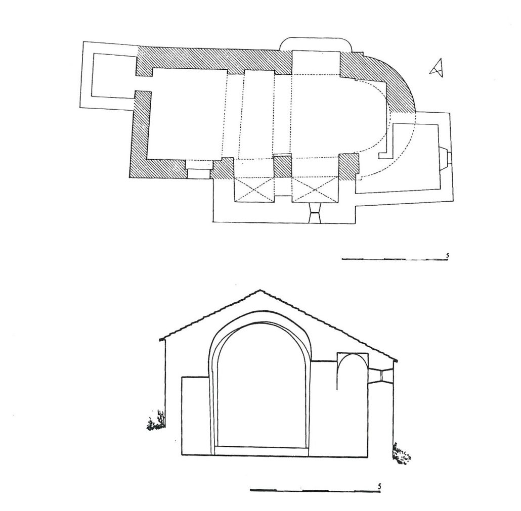 Amb el fragment d’absis el més destacable és la porta, també d’estil llombard, d’arc de mig punt amb dovelles resseguides per un arc de pedres primes i un de concèntric de dents d’engranatge.