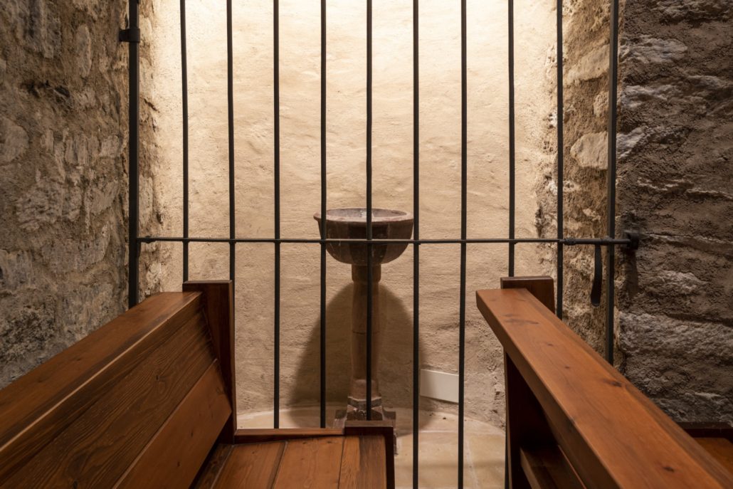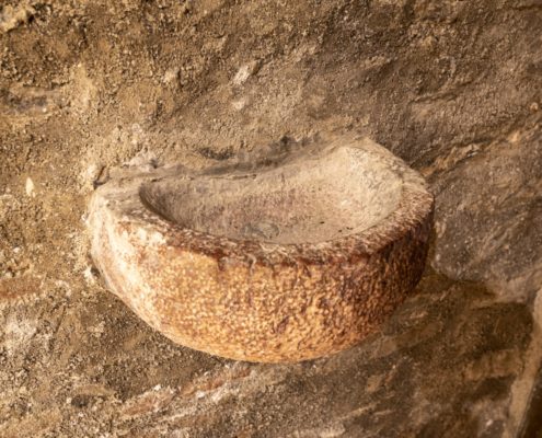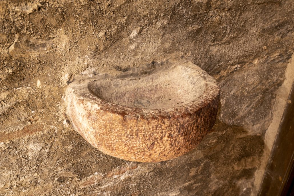 La portalada, que estava originàriament al mur de migdia, conserva les dues arquivoltes de granit decorades amb caps d’homes, d’animals i geometries.
