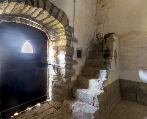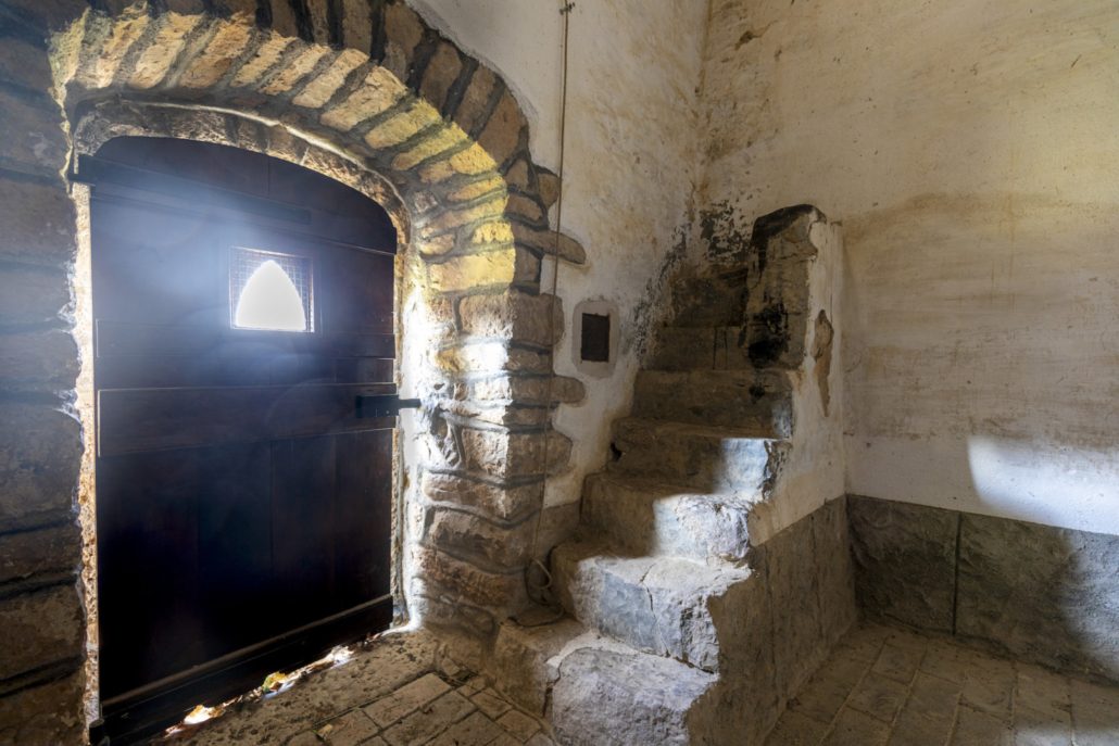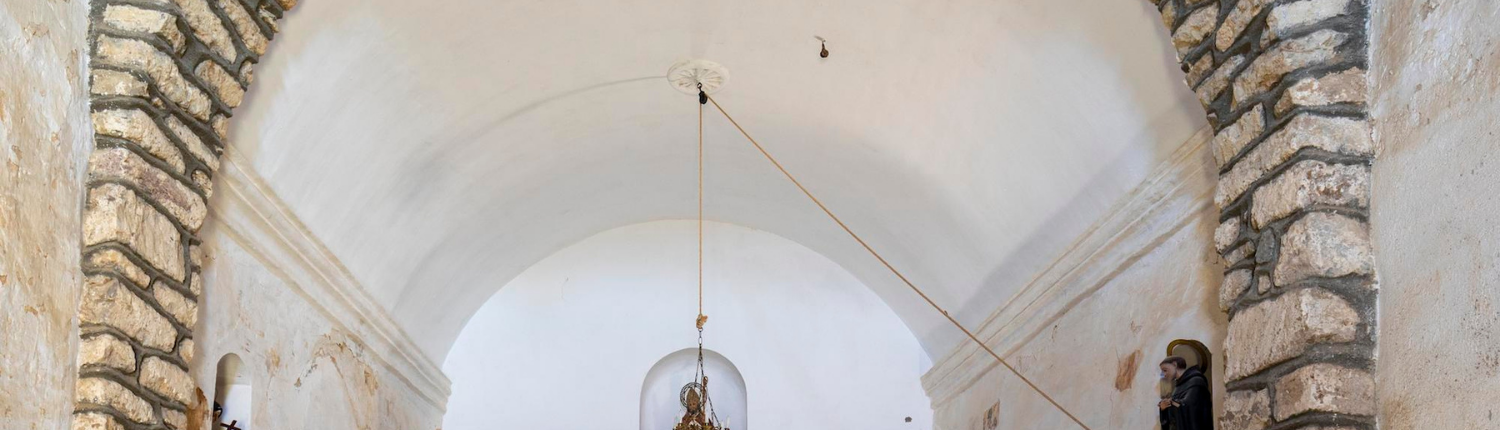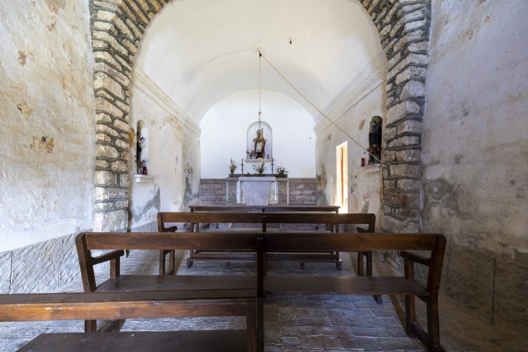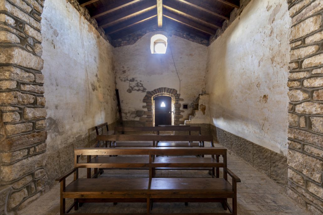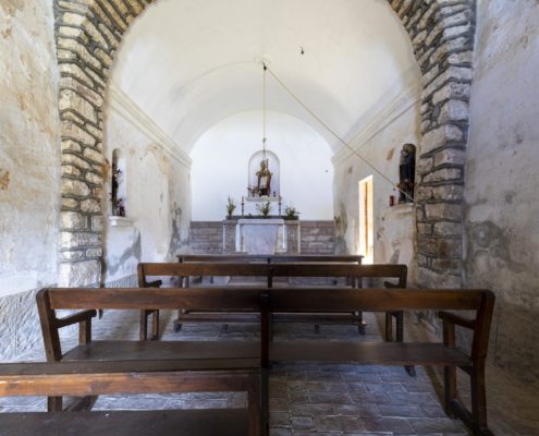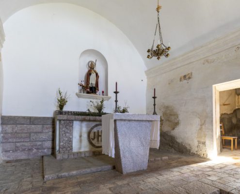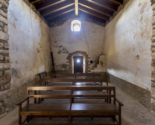 A l’interior podem diferenciar dos edificis separats per un arc toral rebaixat. La meitat de llevant està coberta amb volta de canó aplatada que arranca des d’una cornisa i possiblement podria ser la supervivent d’un edifici més antic; la meitat de ponent és més alta i l’embigat descansa directament sobre les parets.